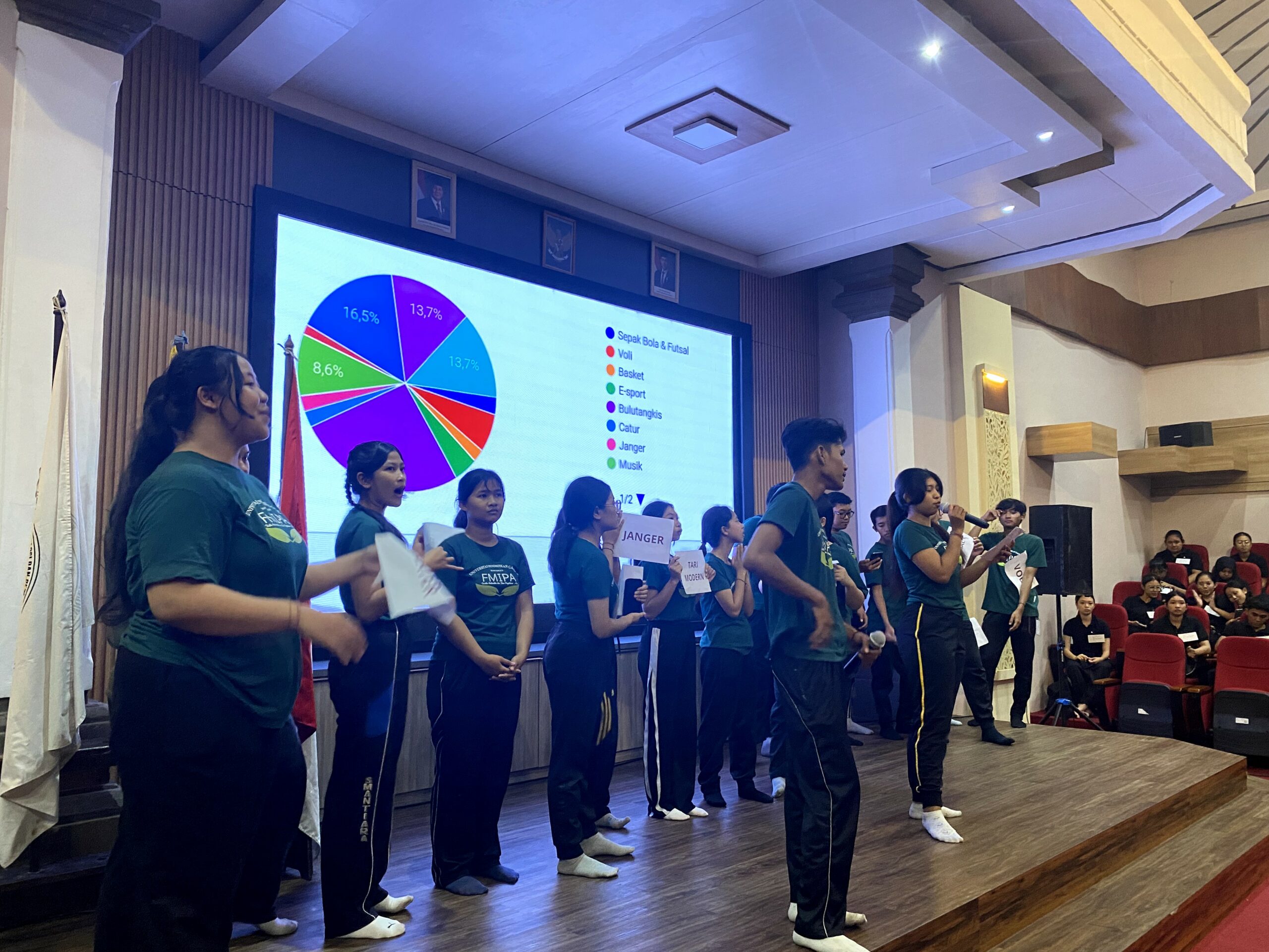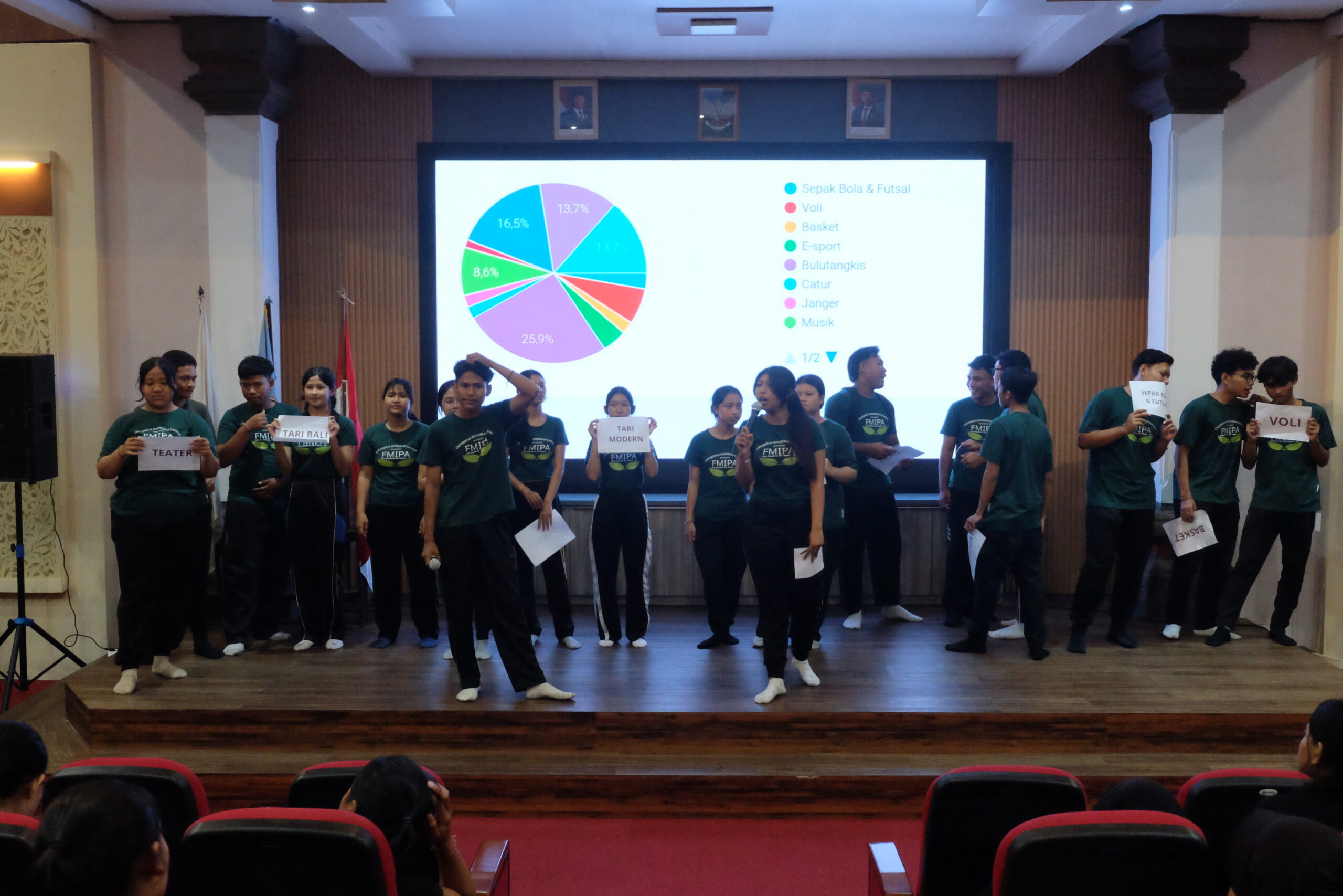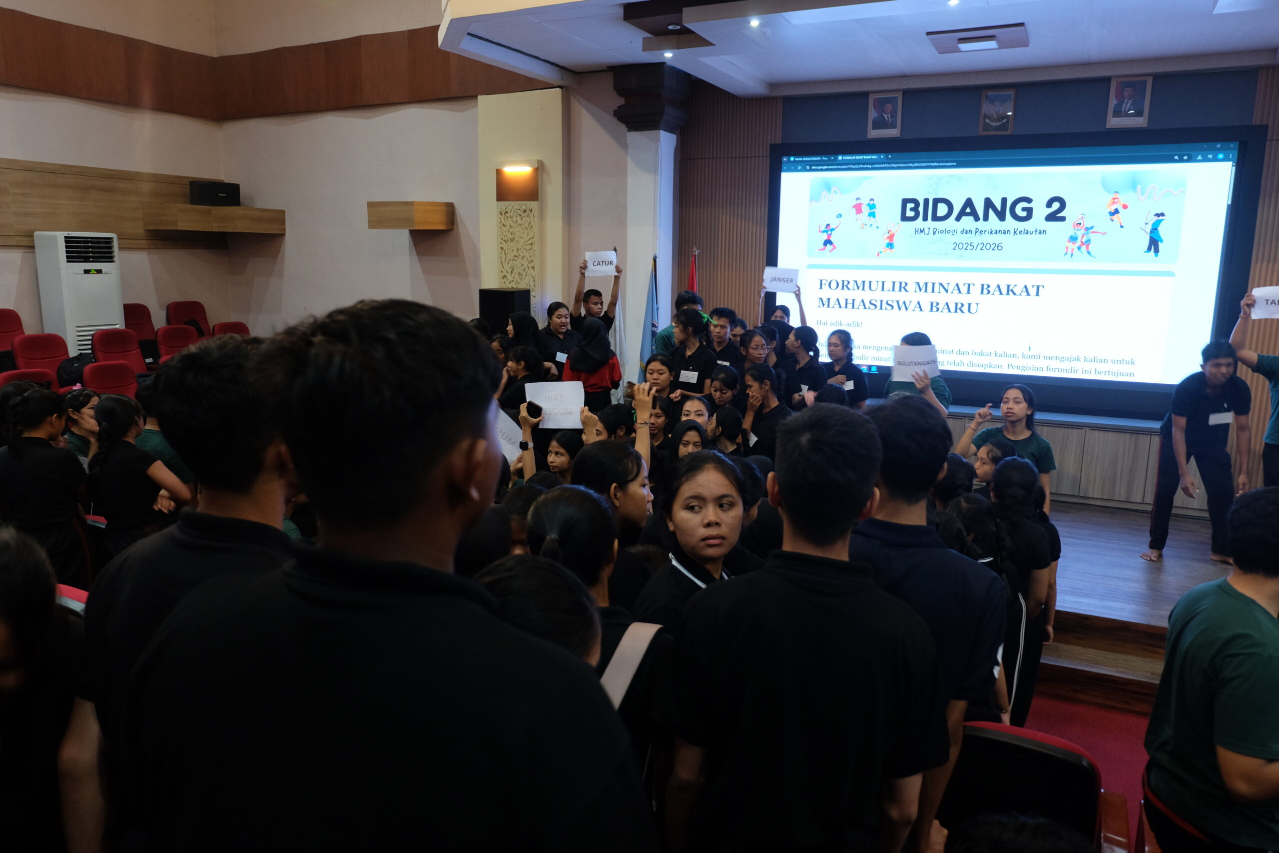 Pada tanggal 18 Agustus 2025, Jurusan Biologi dan Perikanan Kelautan sukses menyelenggarakan Acara Penelusuran Minat dan Bakat yang berlangsung penuh antusiasme dari seluruh mahasiswa dan dosen. Kegiatan ini berhasil menjadi wadah untuk menggali serta menyalurkan potensi akademik maupun non-akademik mahasiswa, sekaligus memperkuat rasa kebersamaan dan identitas jurusan. Dengan tujuan utama membangun karakter unggul, kreatif, serta berdaya saing, acara ini menargetkan lahirnya generasi mahasiswa yang tidak hanya berprestasi di bidang akademik, tetapi juga memiliki soft skills yang kuat melalui seni, olahraga, dan kreativitas. Puncak acara dimeriahkan oleh penampilan pentas seni mahasiswa Angkatan Delphinus delphis, yang berhasil memukau penonton dengan penampilan yang menarik, menjadi simbol keberhasilan penyelenggaraan kegiatan yang inspiratif dan berkesan.