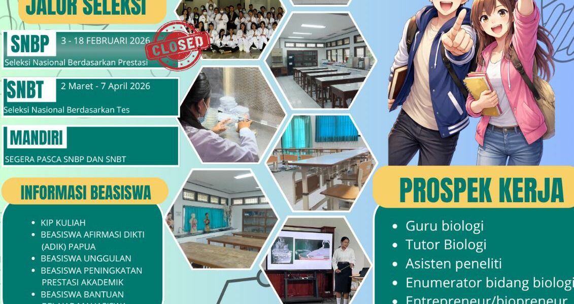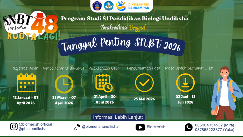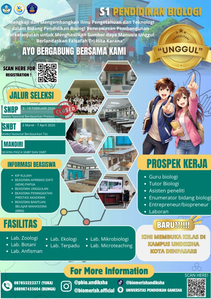 Program Studi S1 Pendidikan Biologi Universitas Pendidikan Ganesha (Undiksha) membuka kesempatan emas bagi calon mahasiswa terbaik untuk bergabung melalui jalur Seleksi Nasional Penerimaan Mahasiswa Baru (SNPMB) 2026. Di prodi ini, kalian tidak hanya mempelajari konsep biologi secara mendalam, tetapi juga dibekali kompetensi pedagogik, keterampilan laboratorium, serta pengalaman lapangan yang relevan dengan kebutuhan abad ke-21. Didukung dosen profesional, fasilitas laboratorium yang memadai, dan atmosfer akademik yang kolaboratif, S1 Pendidikan Biologi Undiksha siap mencetak pendidik dan inovator sains yang unggul, berkarakter, dan berdaya saing. Saatnya wujudkan cita-cita kalian bersama kami melalui SNPMB 2026!